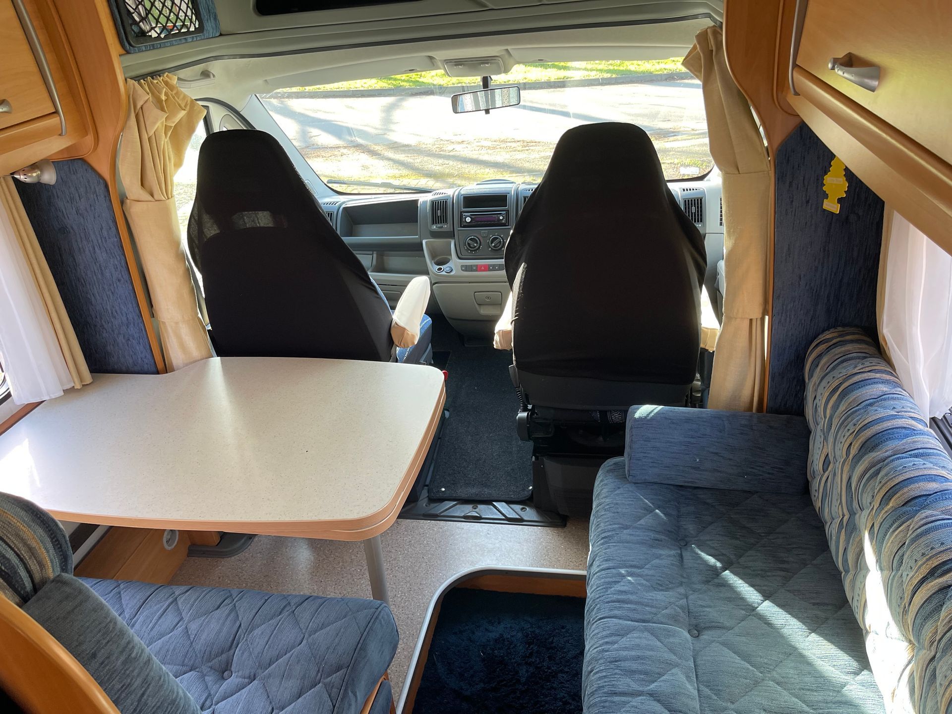 One fixed French (double) bed and one pop-up double bed. 2 seat belts up-front in Captains chairs and 2 more seatbelts in the dining area.